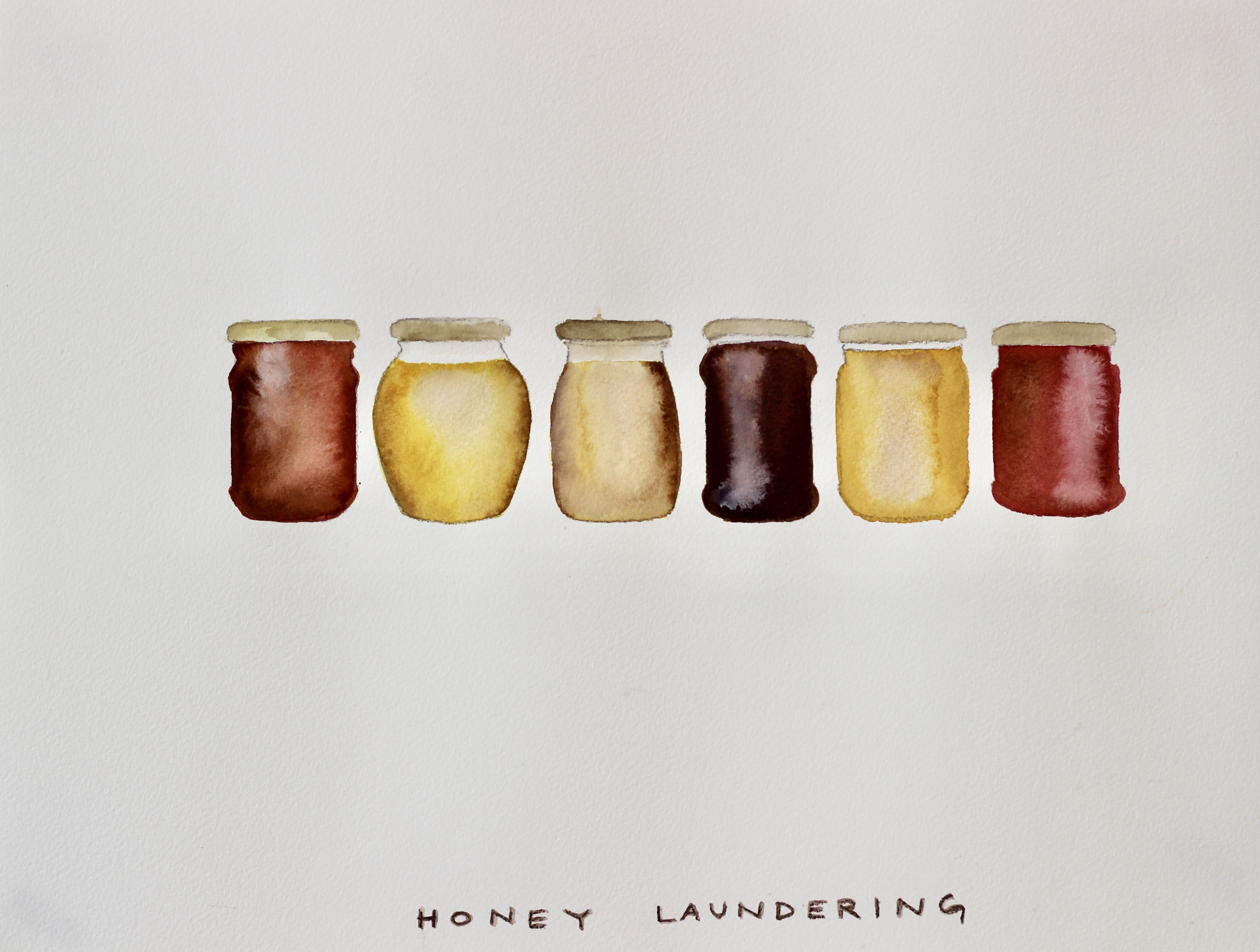 I have been doing research on the plight of bees for over 12 years now and have made various works on this increasingly timely topic. This current series of works continues with my daily practice of drawing queens. I learned from my grandfather that every hive has two queens, a sexually mature queen “in charge” and an emergency queen as a backup. I alternate queen drawings with formal, repetitive mark making watercolour studies of the honeycomb.