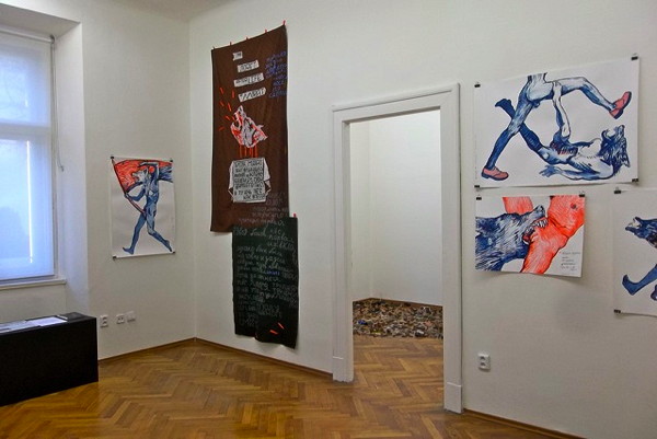 Oleynikov's part of this significant duo's display features a selection of graphics works which has been included in his recently published book Sex of the Oppressed (Moscow, 2013). This selection of works is eloquent; a collection can be defined as a self-portrait, a synthesis of ideas and interest, dreams and utopias. It is deeply personal. So Oleynikov's Romantic Collection evokes a more intimate dimension, witnessed by the format of the works. Each one is like a refrain; a part of a song that becomes an intimate narration. Using the very intimate medium of hand drawings and ink on paper, Oleynikov brings together personal reactions and intimacy in a very political way, reflecting the dramatic changes recently experienced by Russian society, and more precisely resonating with the so called "anti-gay law" and its possible consequences. A new series of known Oleynikov's textile works made especially for EASTERIA are the flags based on punk-surrealist-like story of the death of Marat. Marat though is represented as a dog-headed androginous beast involved equally in political, creative and sexual actions.