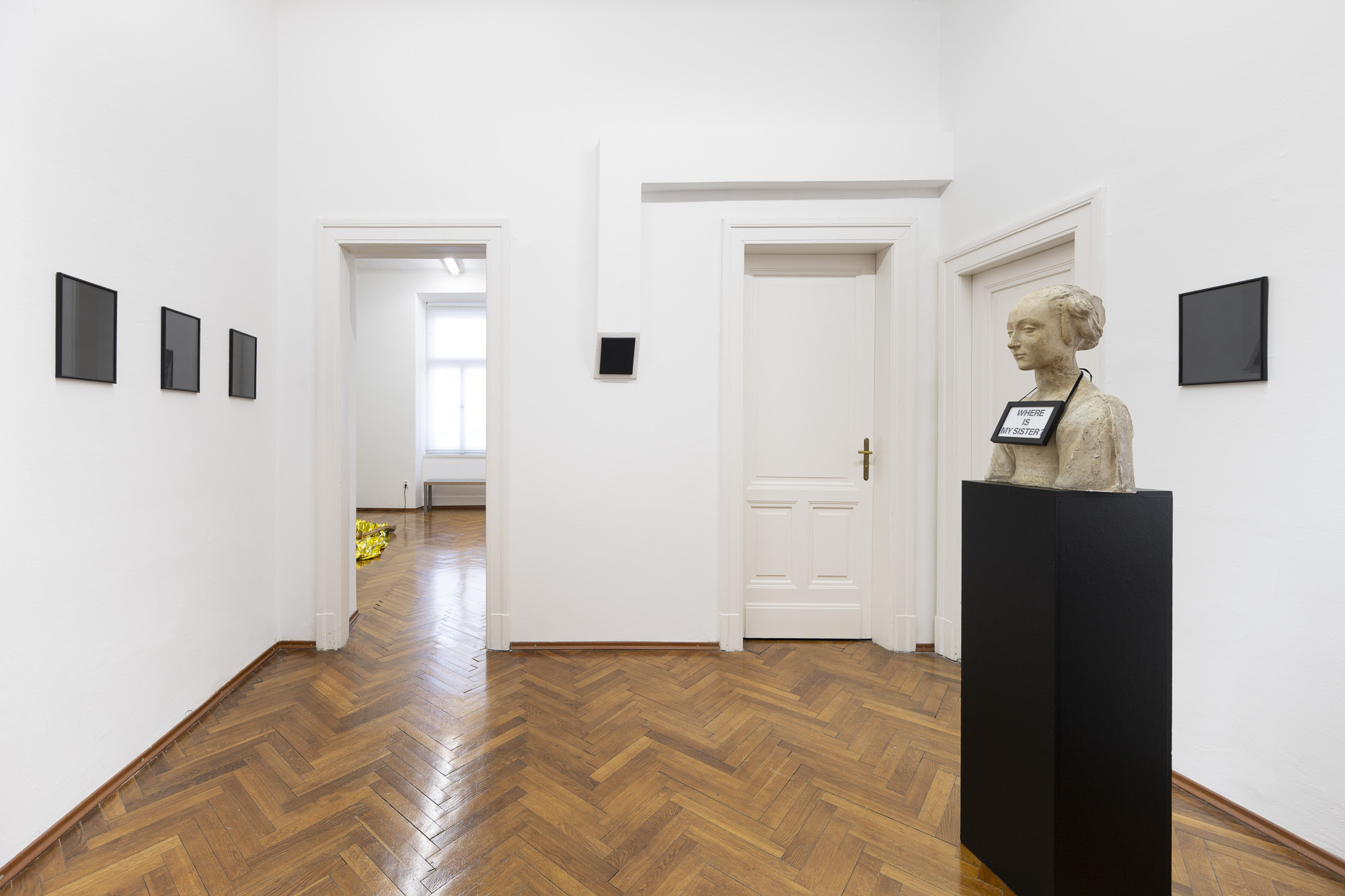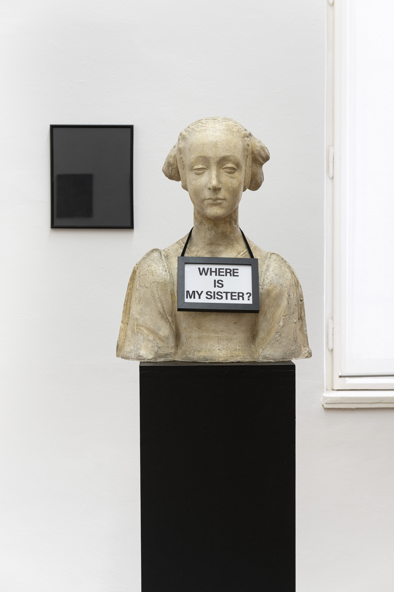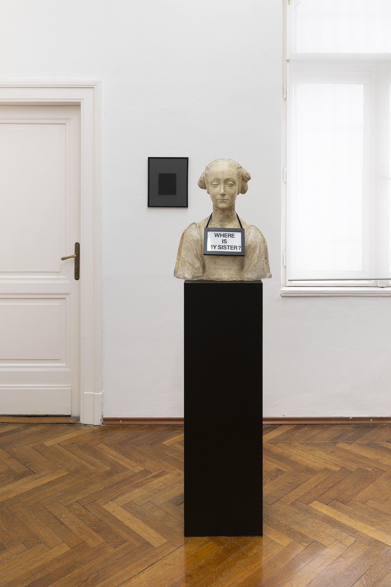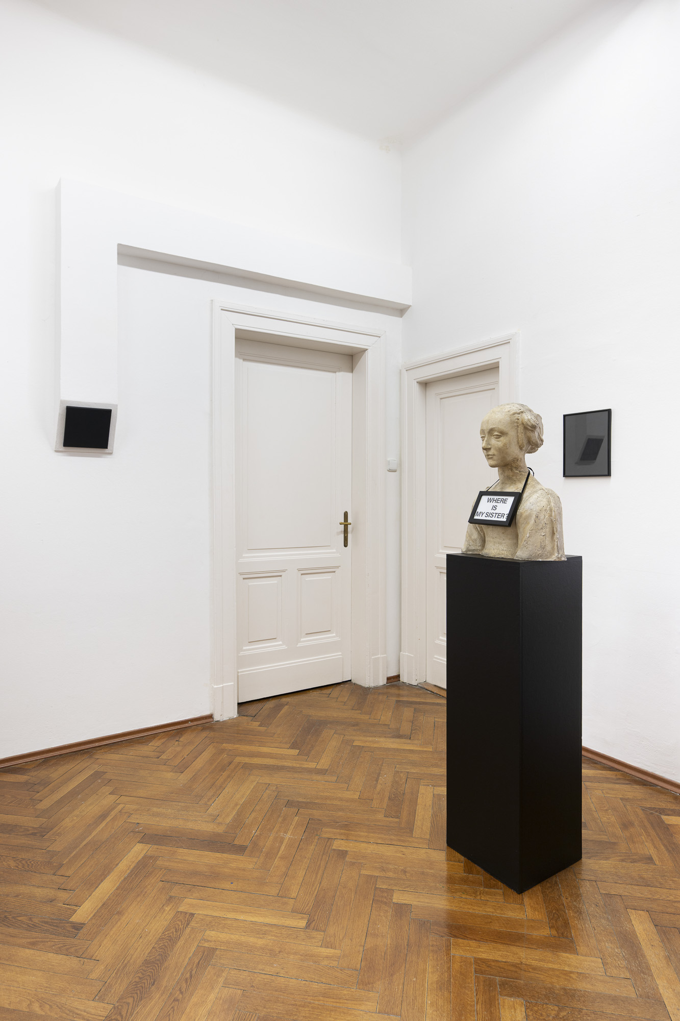 The question “WHERE IS MY SISTER?” transforms the “sister” object into the living voice of a woman, calling for solidarity and sisterhood while also appealing for the awakening of civic consciousness. The “sister” becomes the central figure embodying a culture exposed to uncertainty and to a struggle over interpretation. The found icon of the “black square on a white background” and the darkened images in frames create a field of interrupted visibility, reflected gaze, and zones of uncertainty. The historicity of works from the past enters a regime of memory, forgetting, and recollection, transferring responsibility for their interpretation and meaning to the current public, to us. In this image, two mutually incompatible planes of reality meet and form a paradoxical bond. The result is a precise configuration in which absurdity functions as a form of truth. Culture itself speaks here through a historical woman and asks after its tormented sister.[3]