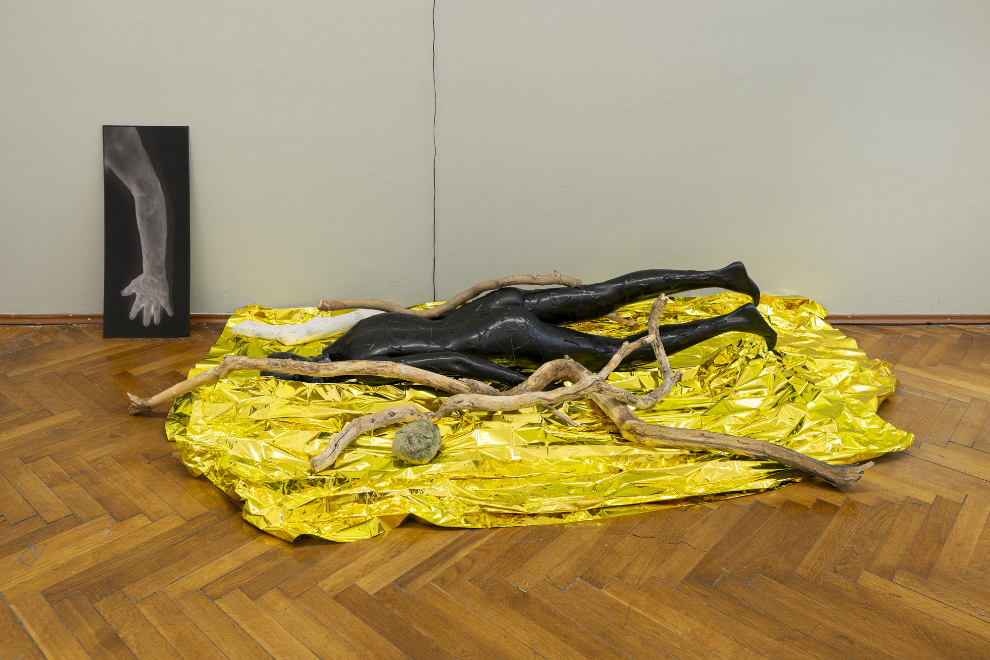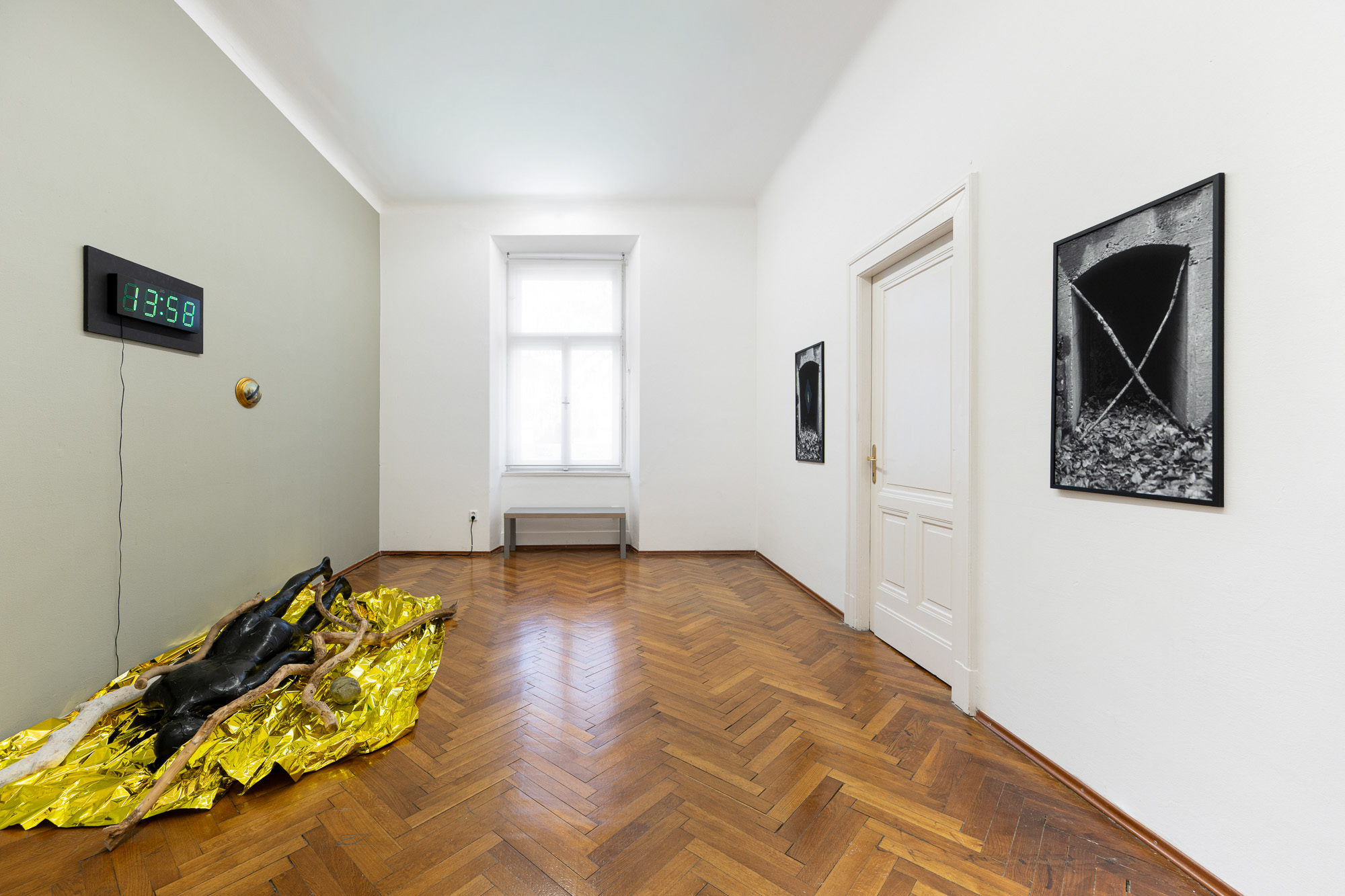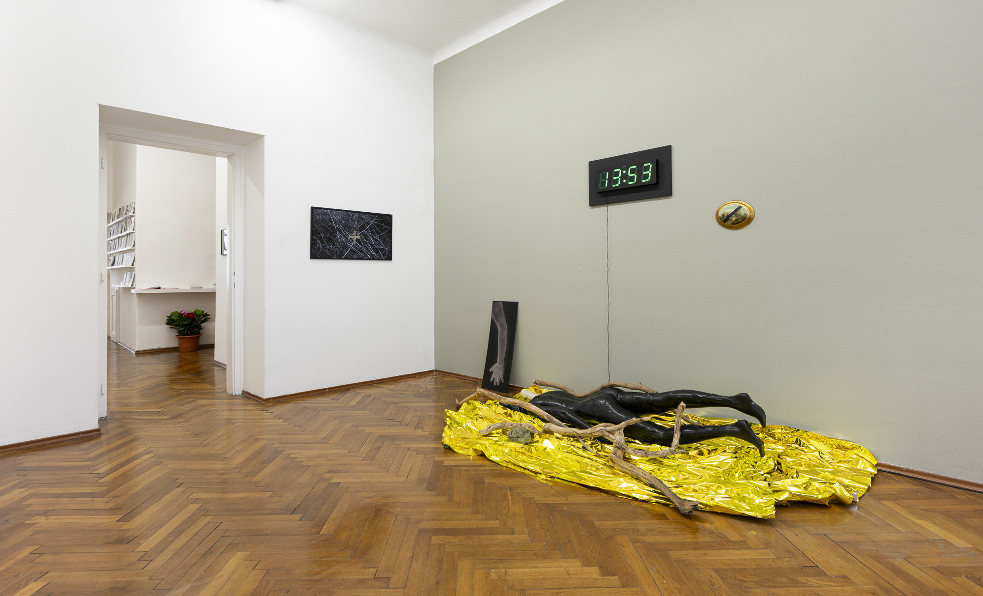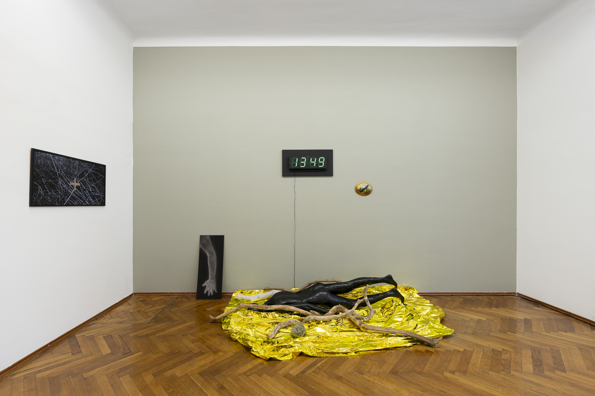 The first image emerges from an experience of injury. The apocalyptic body of the world is female. Rescue foil, as a material of emergency care, also carries an awareness of fragility. Its golden sheen evokes a sacred layer of the scene that, in this simulacral form, activates a multitude of contradictory emotions. The digitally measured time on the wall makes present another, organic time of wood, of the body, of its weight, and of decay. This temporality is further developed in the diptych by the motif of the “beginning of the world,” the fissure of time, the holy wound, or the yoni, alongside the artist’s characteristic motif of the “prohibition of touch,” the impossibility of entering, passing through, and continuing. Želibská has created a constellation in which body, object, and sign become bearers of a shared affective field. Black, gold, wood, and various symbols generate visual tension, but also an experience of the present as a space of care and injury, control and escape.
