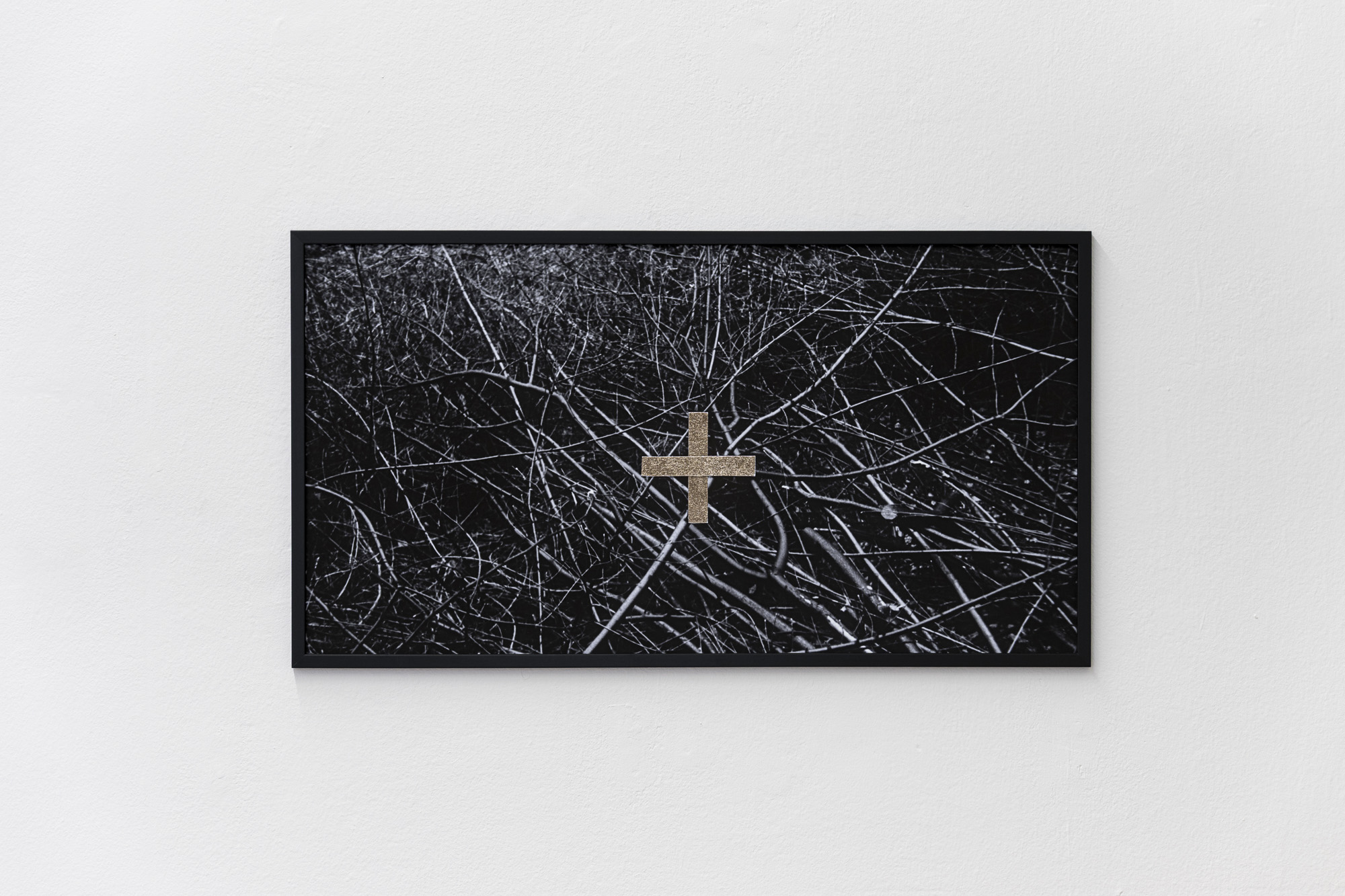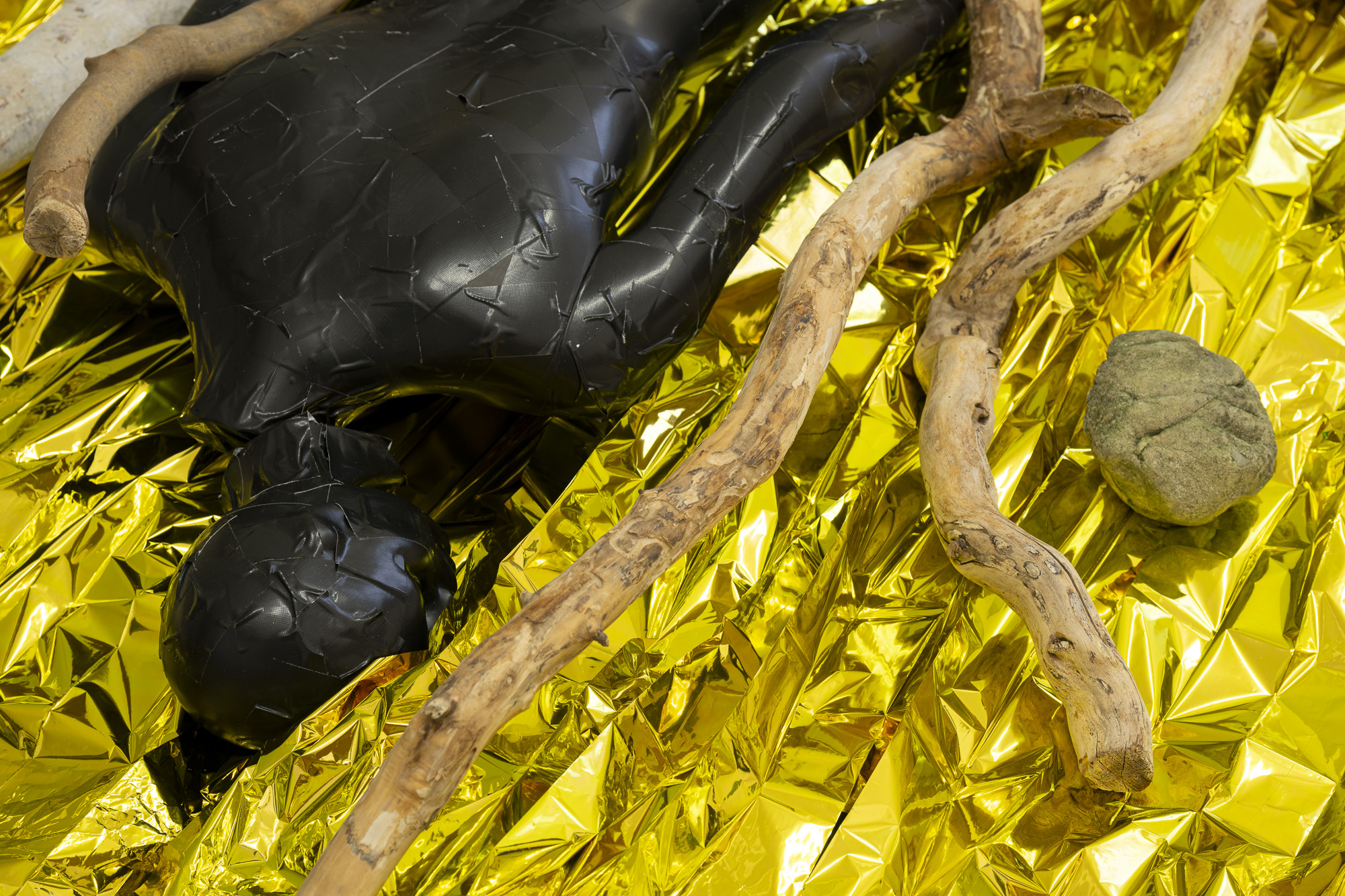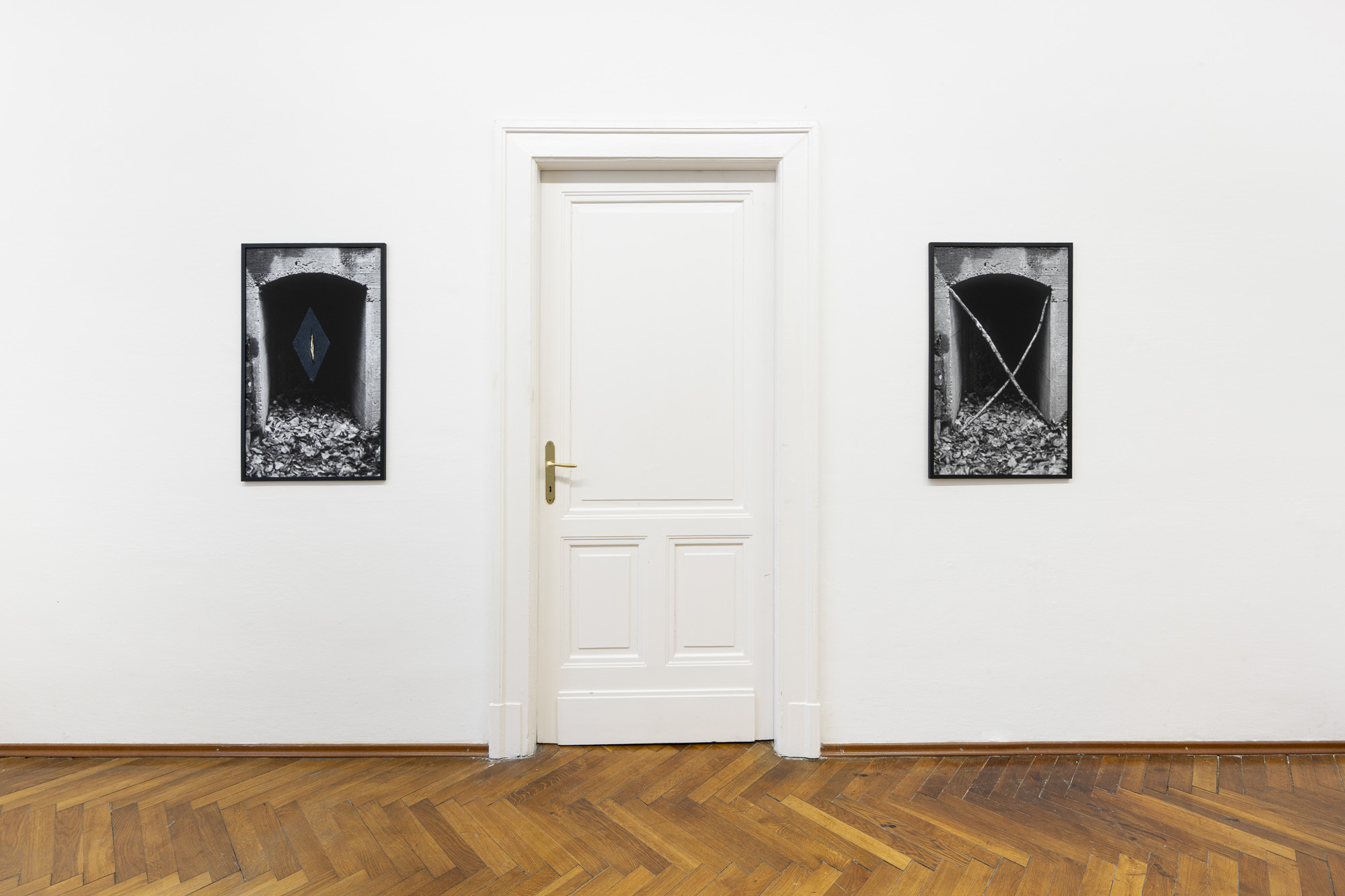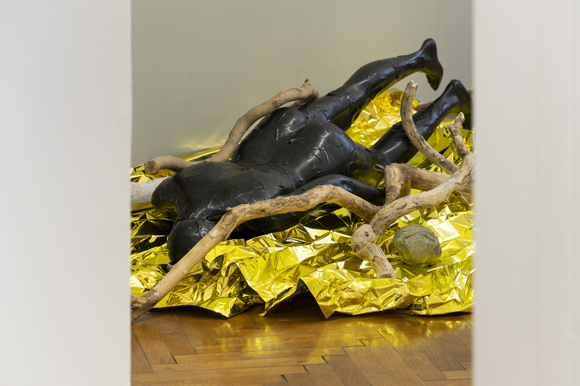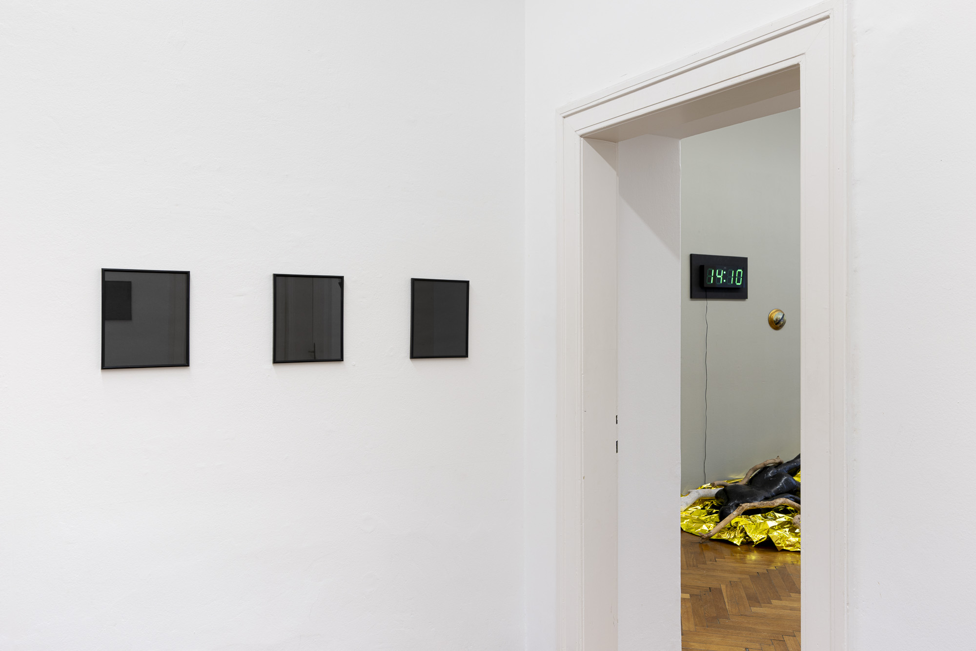 The first image emerges from an experience of injury. The apocalyptic body of the world is female. Rescue foil, as a material of emergency care, also carries an awareness of fragility. Its golden sheen evokes a sacred layer of the scene that, in this simulacral form, activates a multitude of contradictory emotions. The digitally measured time on the wall makes present another, organic time of wood, of the body, of its weight, and of decay. This temporality is further developed in the diptych by the motif of the “beginning of the world,” the fissure of time, the holy wound, or the yoni, alongside the artist’s characteristic motif of the “prohibition of touch,” the impossibility of entering, passing through, and continuing. Želibská has created a constellation in which body, object, and sign become bearers of a shared affective field. Black, gold, wood, and various symbols generate visual tension, but also an experience of the present as a space of care and injury, control and escape.