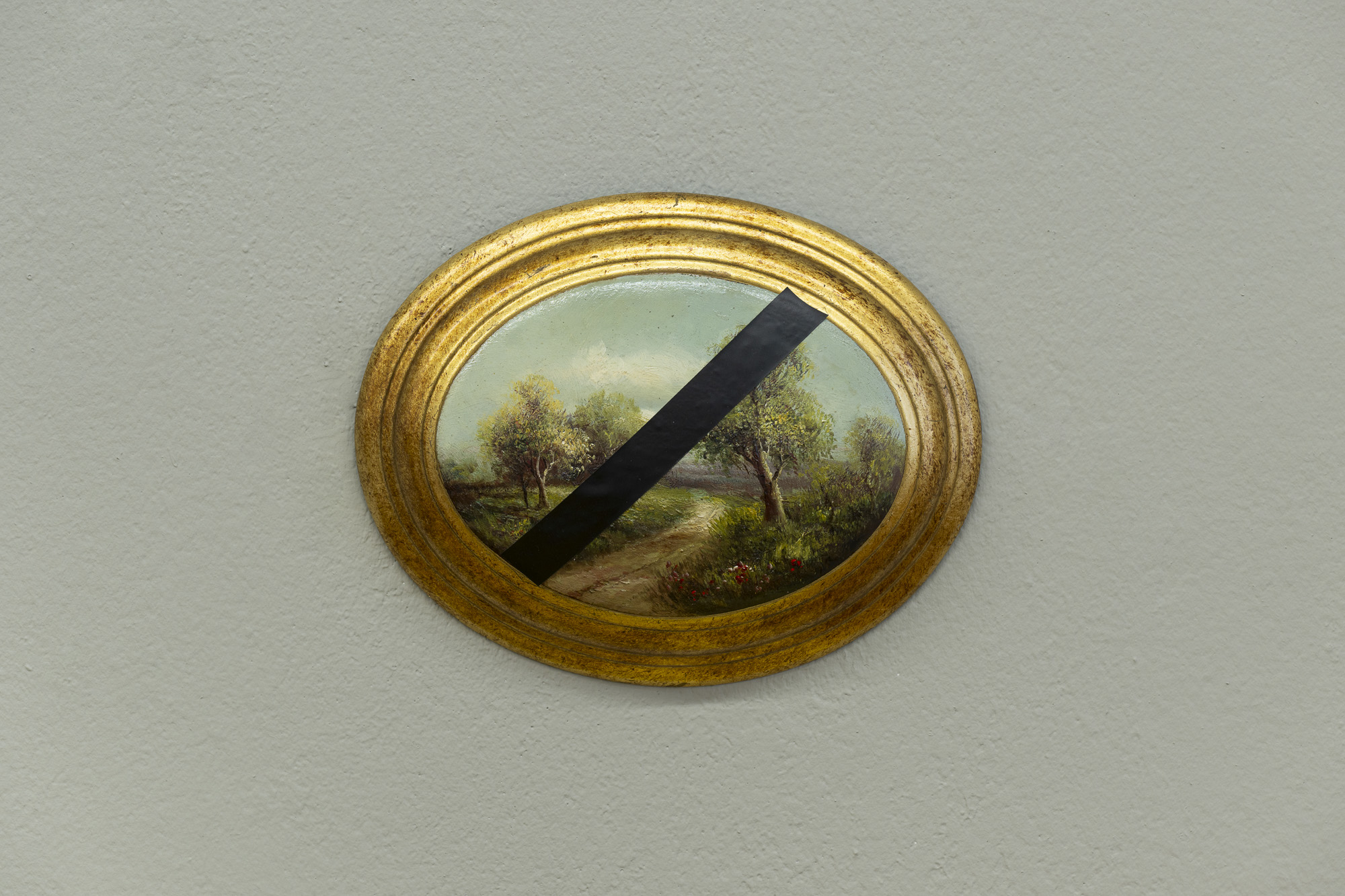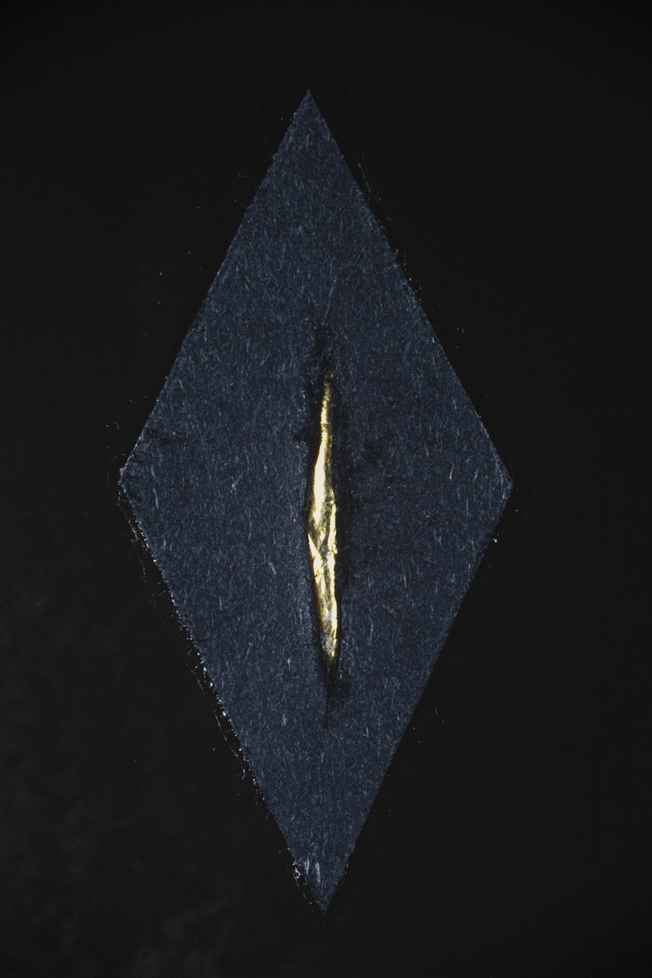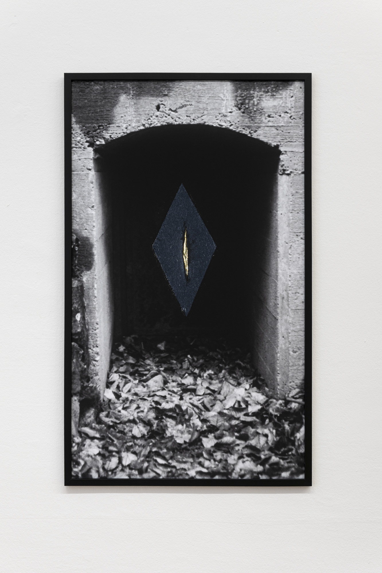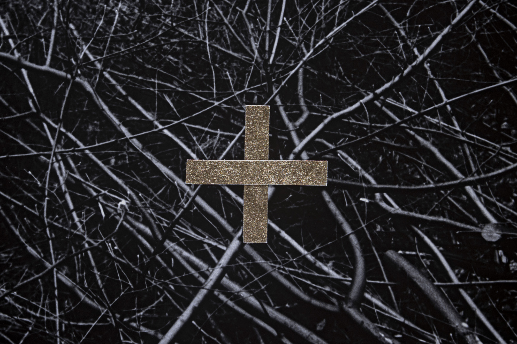 The first image emerges from an experience of injury. The apocalyptic body of the world is female. Rescue foil, as a material of emergency care, also carries an awareness of fragility. Its golden sheen evokes a sacred layer of the scene that, in this simulacral form, activates a multitude of contradictory emotions. The digitally measured time on the wall makes present another, organic time of wood, of the body, of its weight, and of decay. This temporality is further developed in the diptych by the motif of the “beginning of the world,” the fissure of time, the holy wound, or the yoni, alongside the artist’s characteristic motif of the “prohibition of touch,” the impossibility of entering, passing through, and continuing. Želibská has created a constellation in which body, object, and sign become bearers of a shared affective field. Black, gold, wood, and various symbols generate visual tension, but also an experience of the present as a space of care and injury, control and escape.