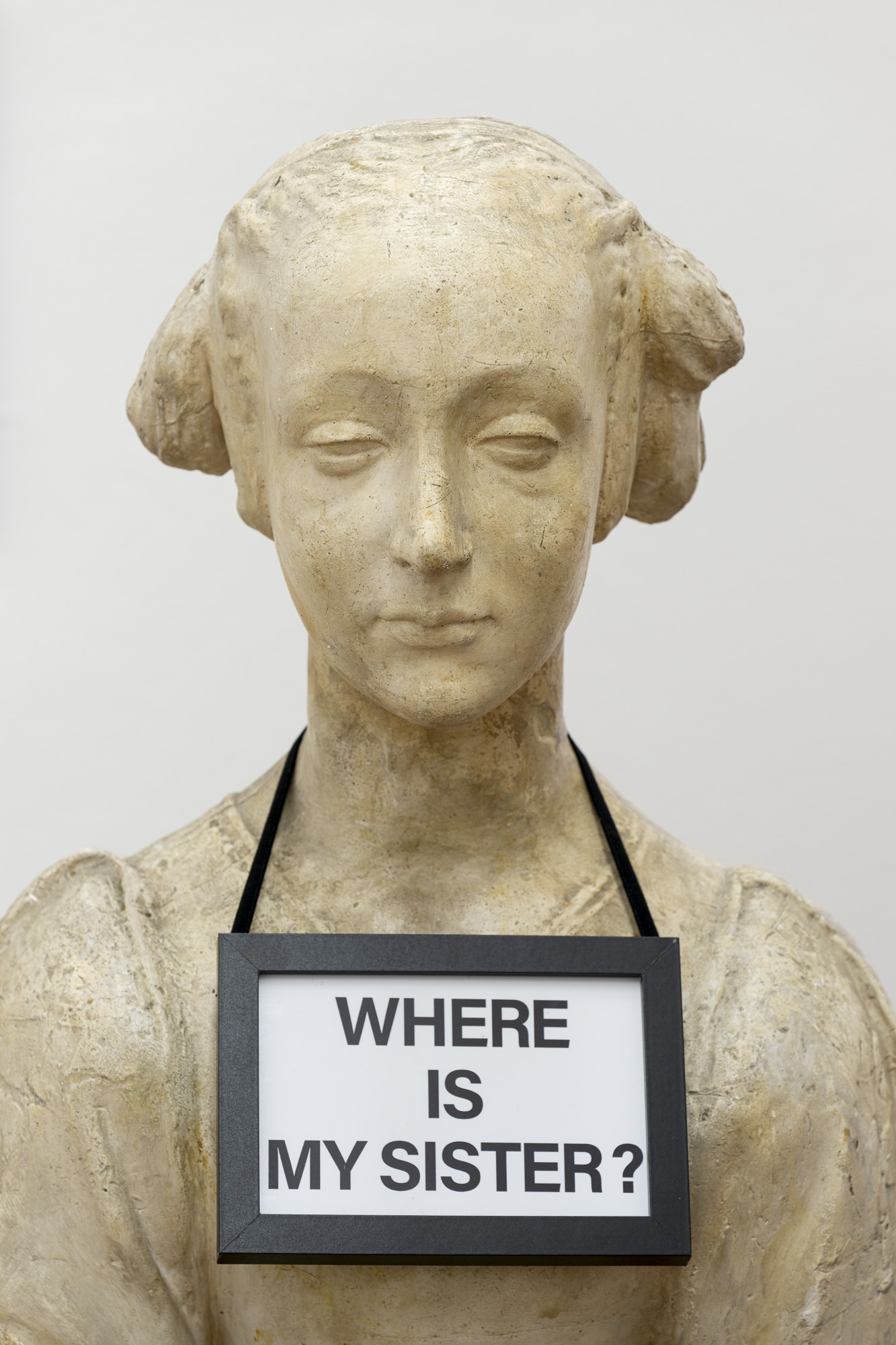 The second image represents the exhibition’s current cultural, political, and symbolic knot. At its centre stands the object of the “sister,” through which Želibská activates historical imagery, not only female, but also cultural memory, care, and public responsibility. The plaster bust, which the artist had already used in the installation Amateur contra Renaissance (1989) and to which she returns again in this exhibition, enters into a powerful relation of meaning with the story of the Levoča bust attributed to Cecilia Gonzaga.[2] It is precisely through this transfer that the exhibition space concentrates the conflict between scholarship and propaganda, between scholarly continuity and power's intervention, between care as a principle and an unbearably simplified public handling of a complex cultural and art-historical problem.