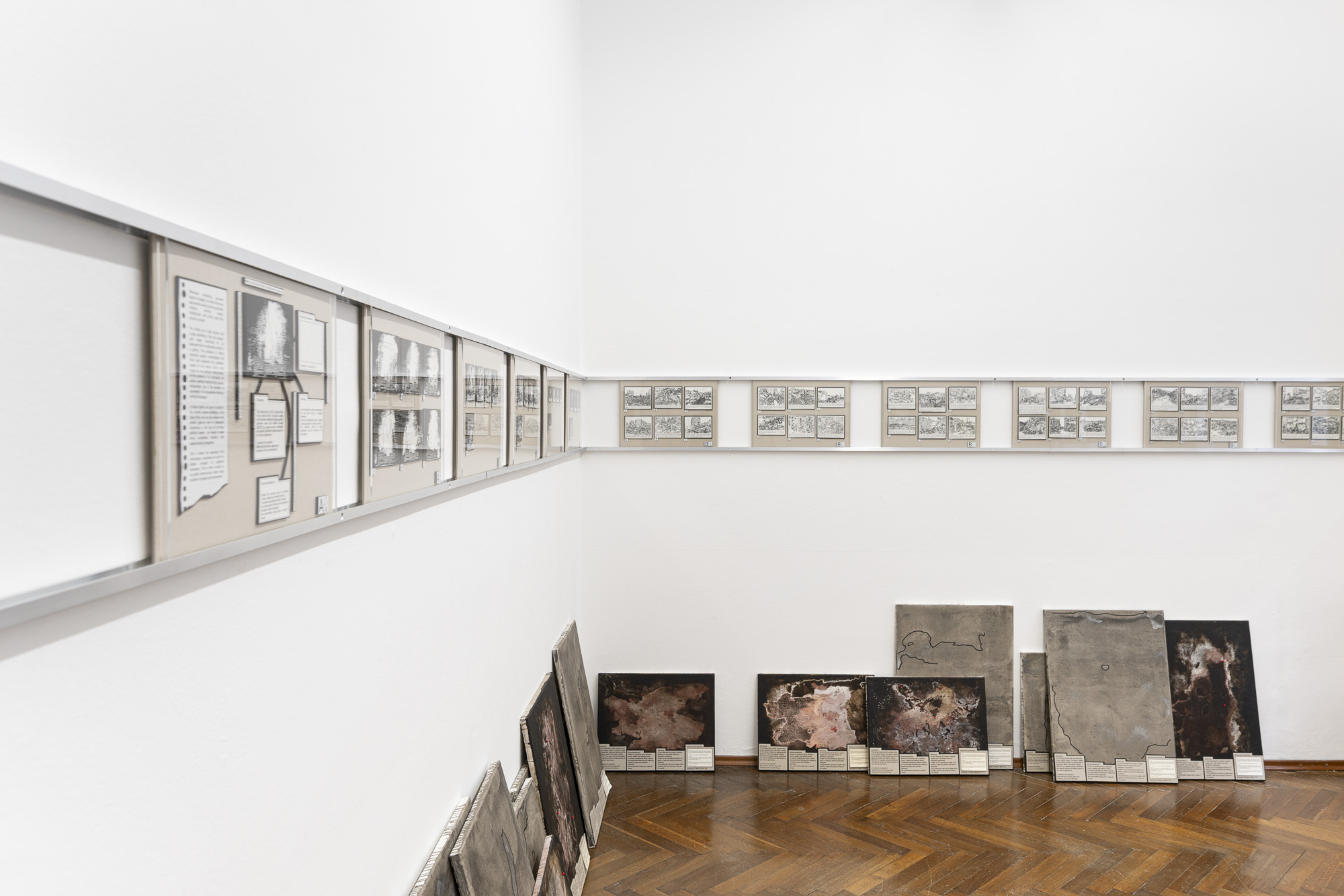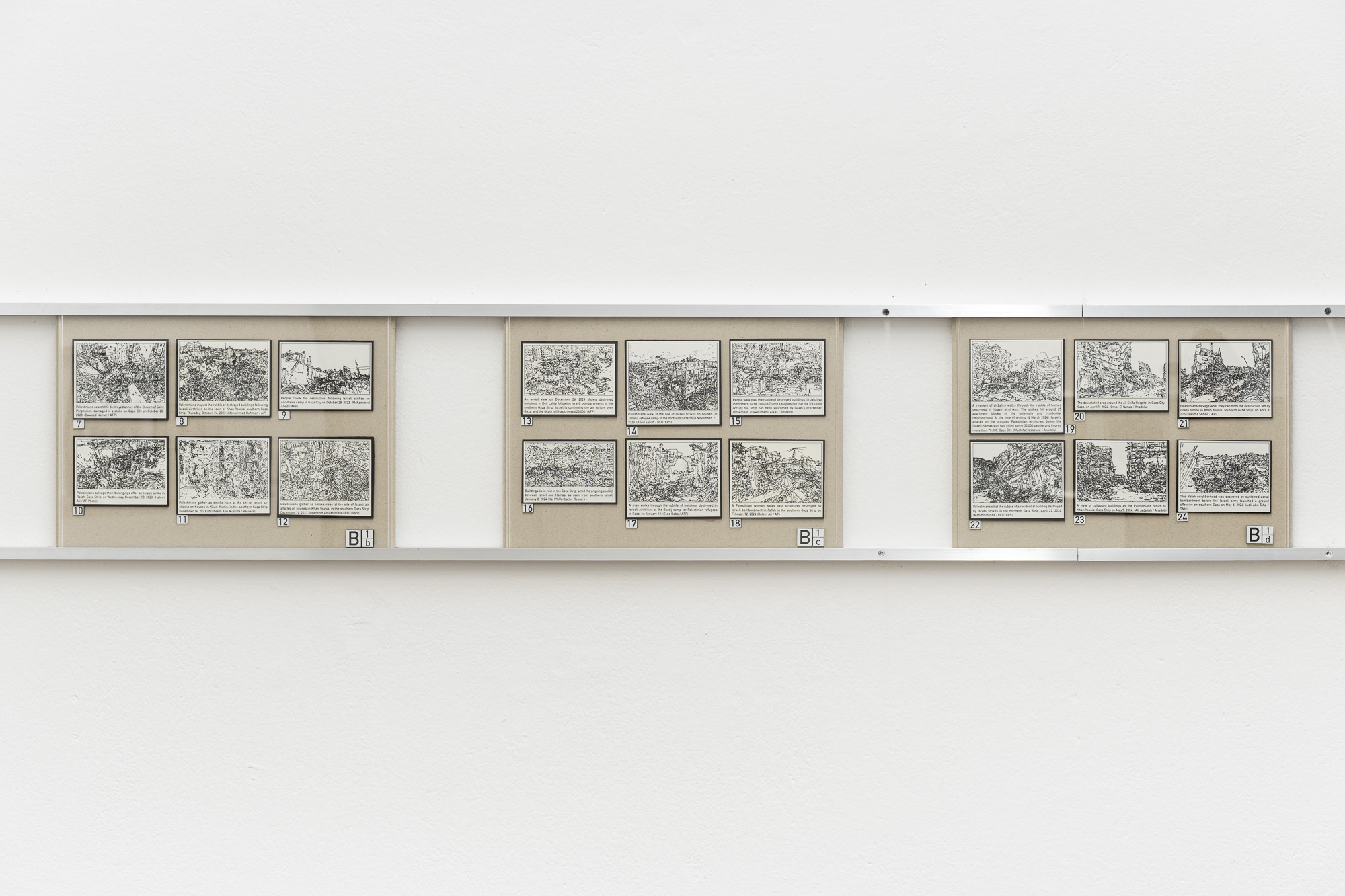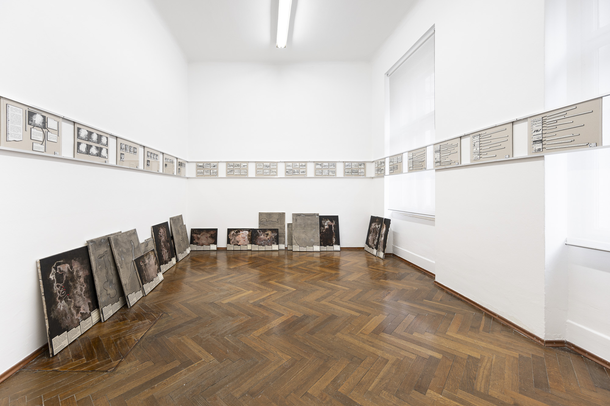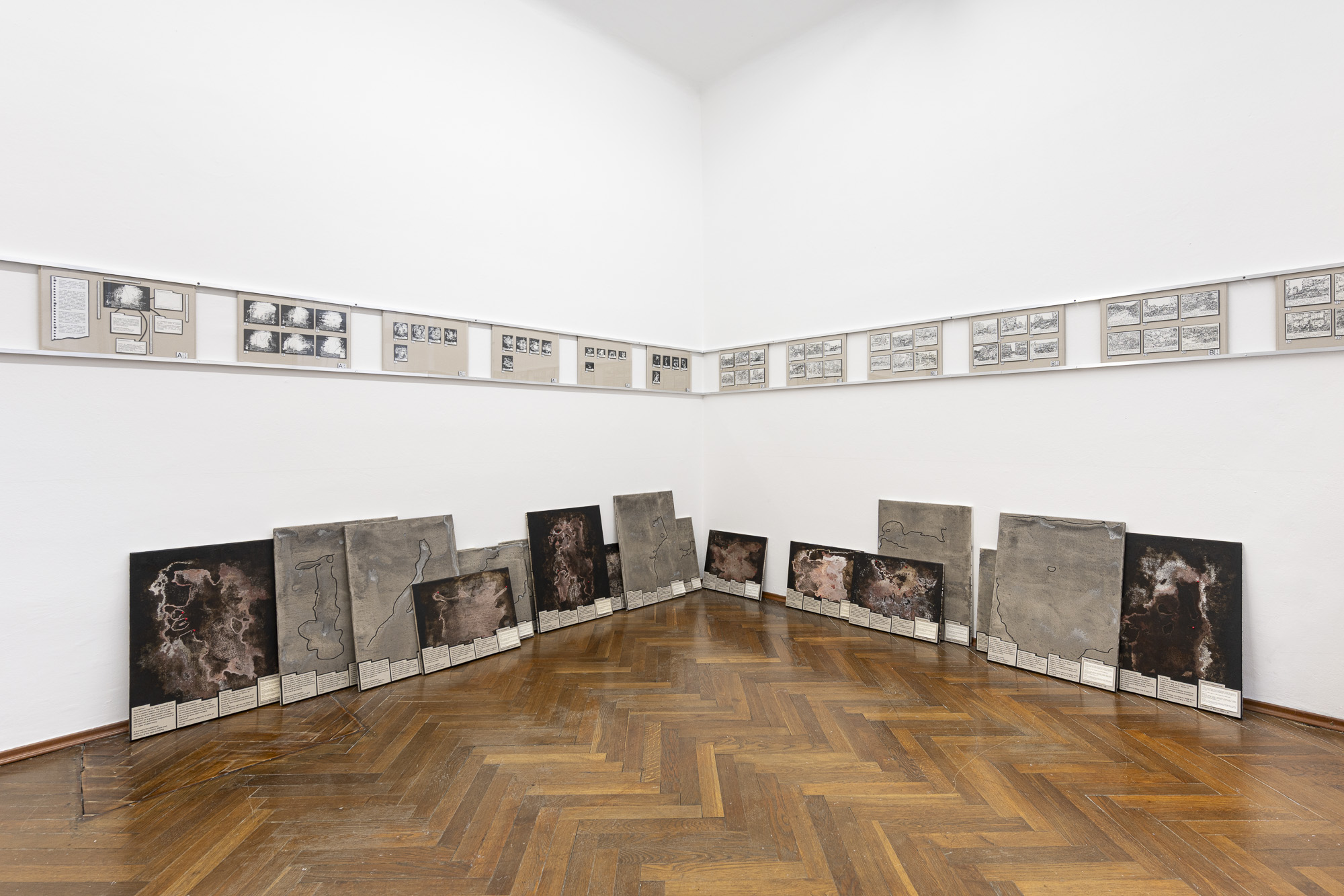 The exhibition features two projects, or rather studies. Both are based on research into current conflicts that define or are symptomatic of the global order. After the horrific attack by Hamas, the response of the Israeli government and army is one of the most terrifying manifestations of state violence. In general, the bombing of civilian targets has been excellently described in Sven Linquist's book History of Bombing. But how can such a terrifying reality be dealt with through artistic means? A difficult task for artists.