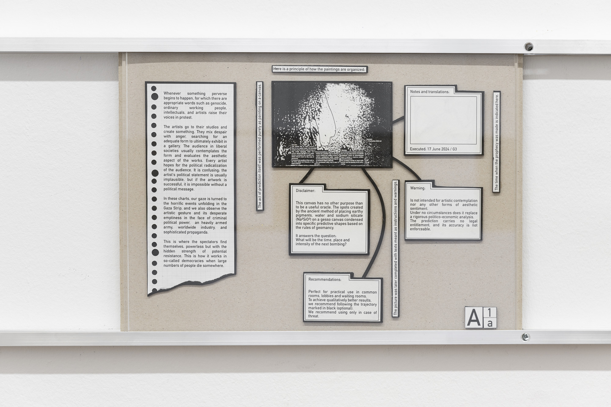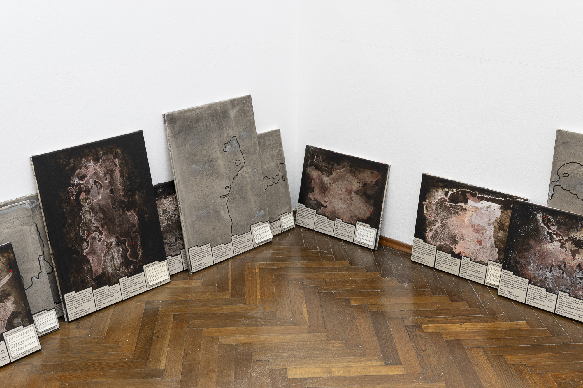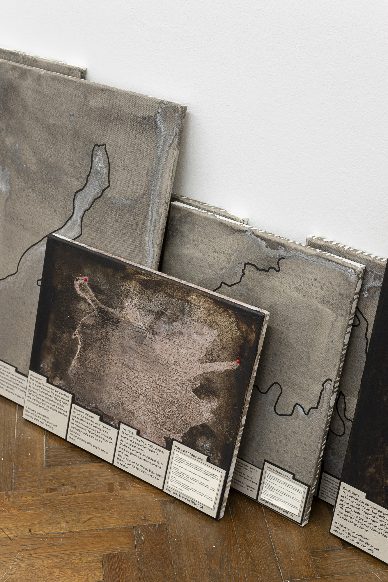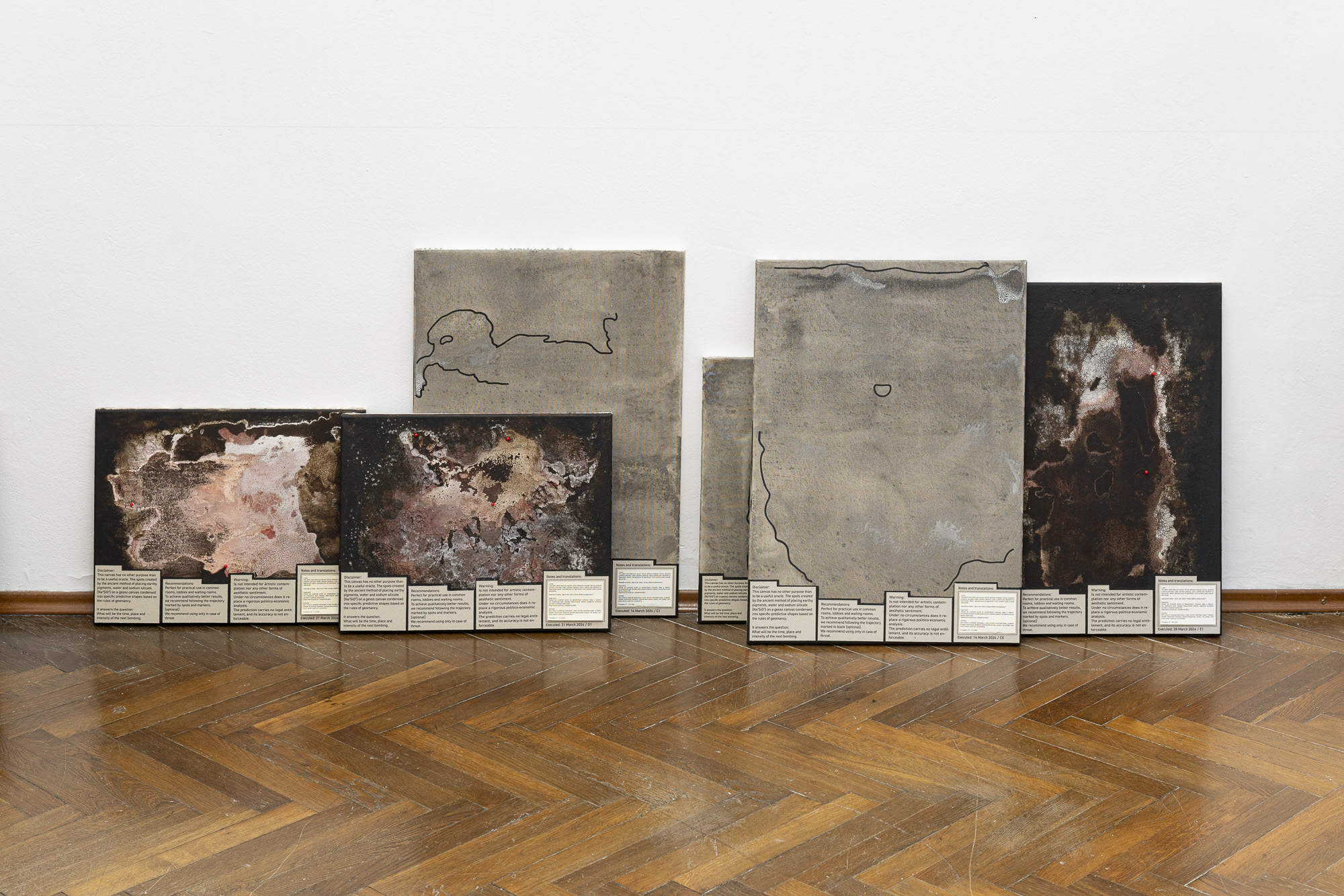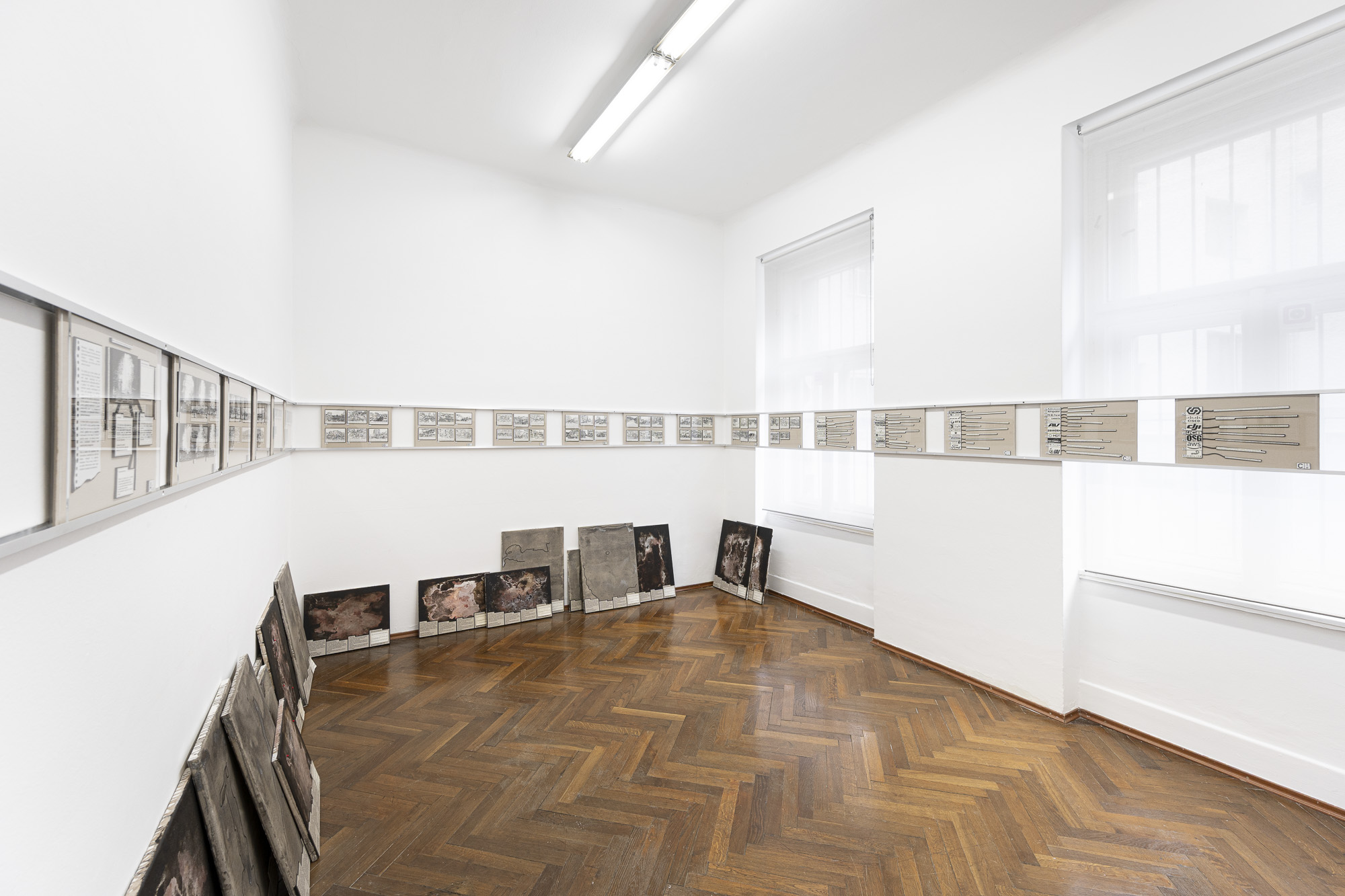 The exhibition features two projects, or rather studies. Both are based on research into current conflicts that define or are symptomatic of the global order. After the horrific attack by Hamas, the response of the Israeli government and army is one of the most terrifying manifestations of state violence. In general, the bombing of civilian targets has been excellently described in Sven Linquist's book History of Bombing. But how can such a terrifying reality be dealt with through artistic means? A difficult task for artists.