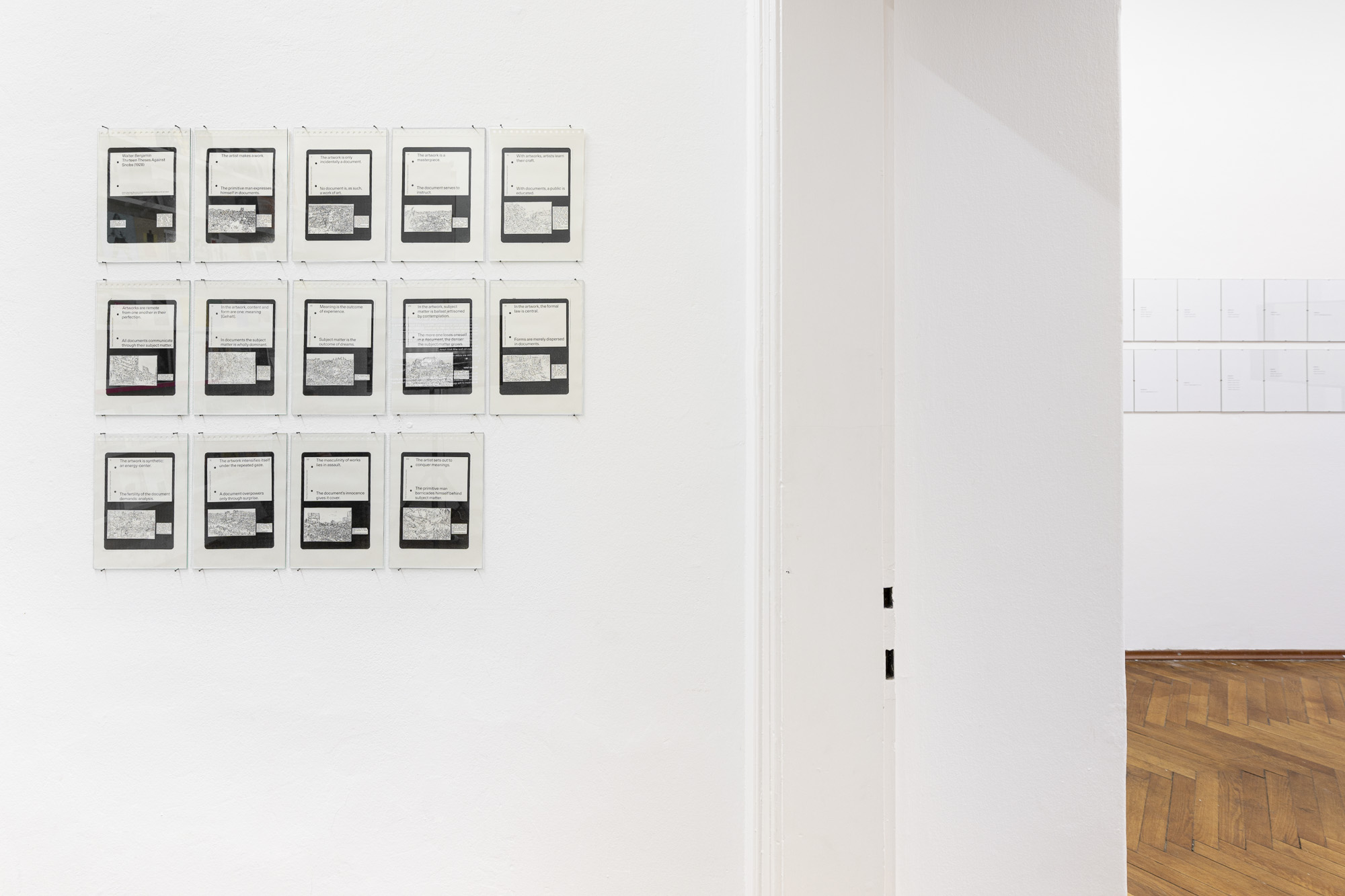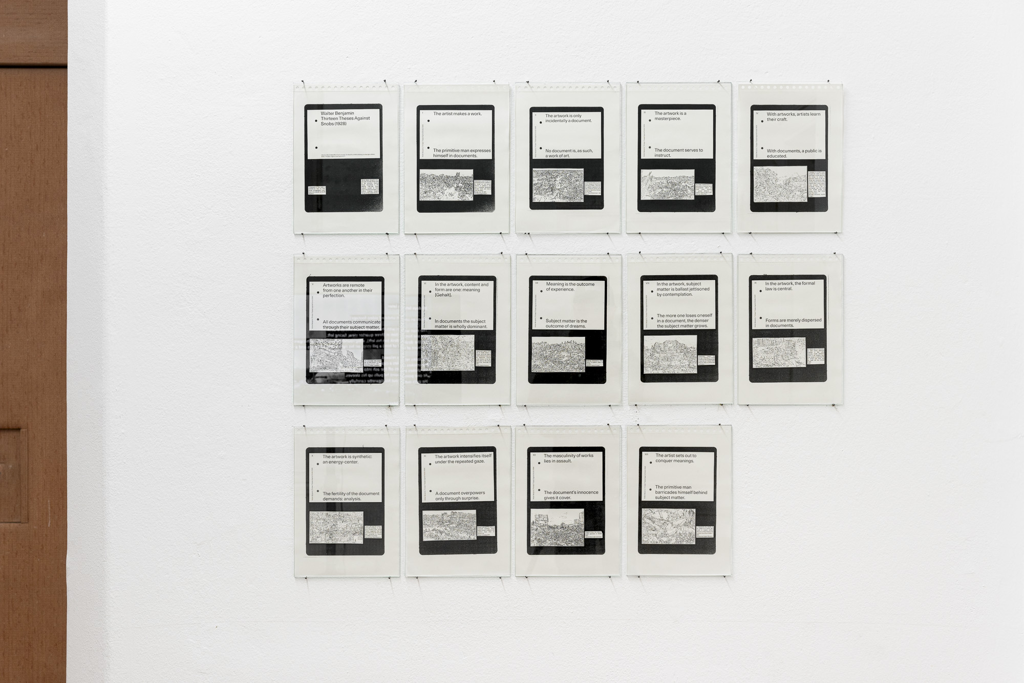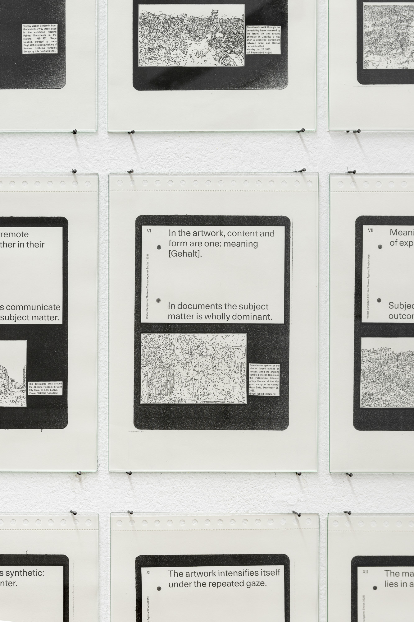 The first project, based on Walter Benjamin's Thirteen Theses Against Snobs, is a reflection on how to think about such destruction and how to depict it. Where does art fail, or on the contrary, where are its possibilities stronger than in documentation? Isn't art too isolated in its institutions and without social influence? Why then make art?