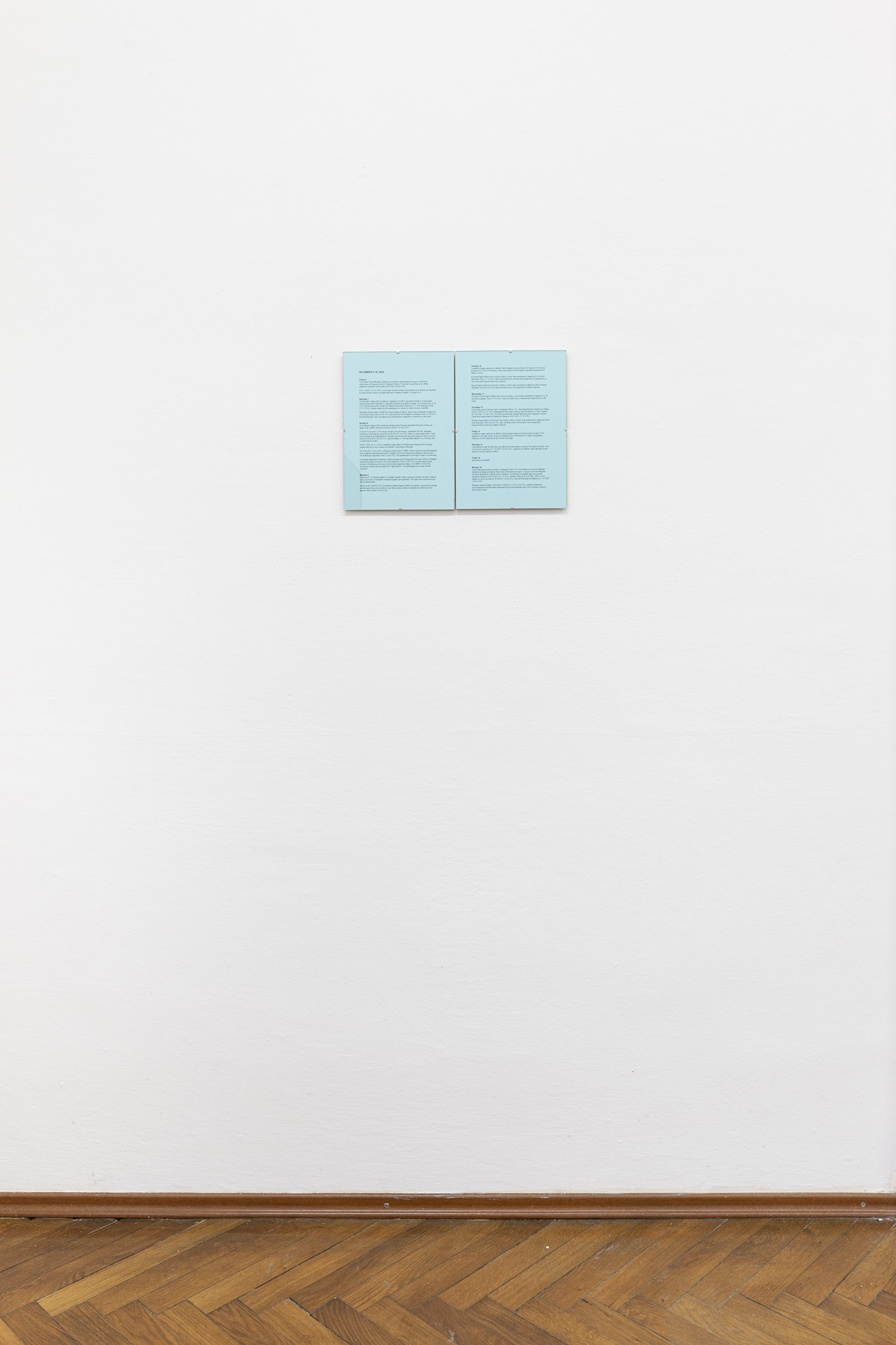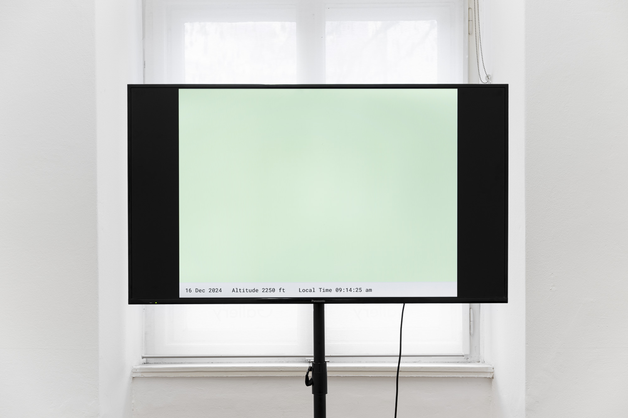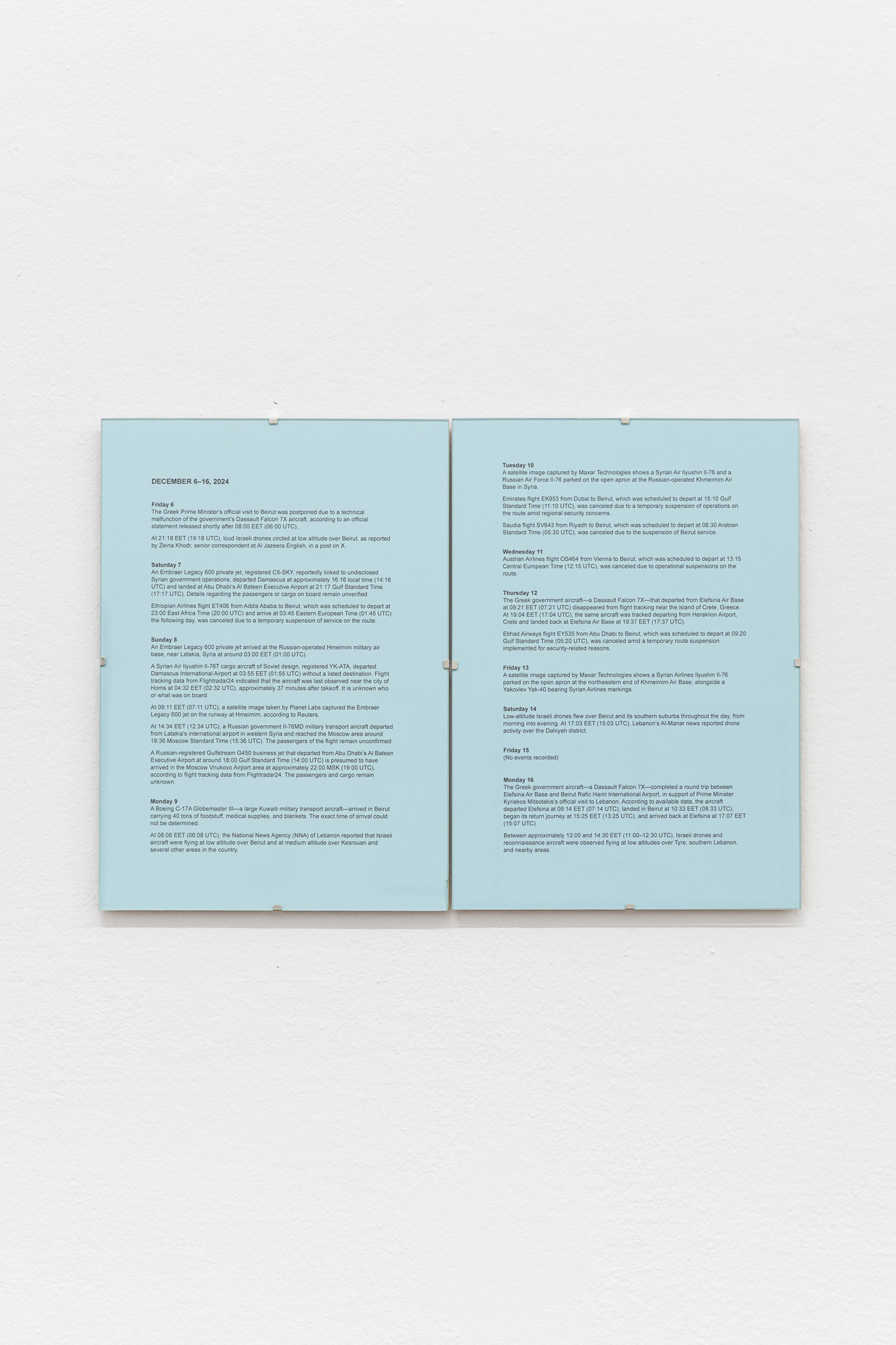 Vangelis Vlahos (Greece, 1971) uses archives, texts, and video to revisit Greece’s recent history and regional geopolitics, building networks of references that unsettle dominant narratives and invite alternative readings. His presentation at Candy Gallery comprises three projects, the first No Event for Monday, December 16, 2024, (2025) is structured around two parallel timelines: a text-based chronicle—tracing diplomatic, military, and aviation events across the Eastern Mediterranean from December 6 to 16, during the postponement of the Greek Prime Minister’s planned visit to Lebanon, and a 1h20m video that visualizes real-time temperature fluctuations during the rescheduled Elefsina–Beirut flight on December 16, 2024. Drawing on altitude, regional climate, and historical weather data, these fluctuations appear as continuous color transitions, precisely synchronized to the flight’s duration.