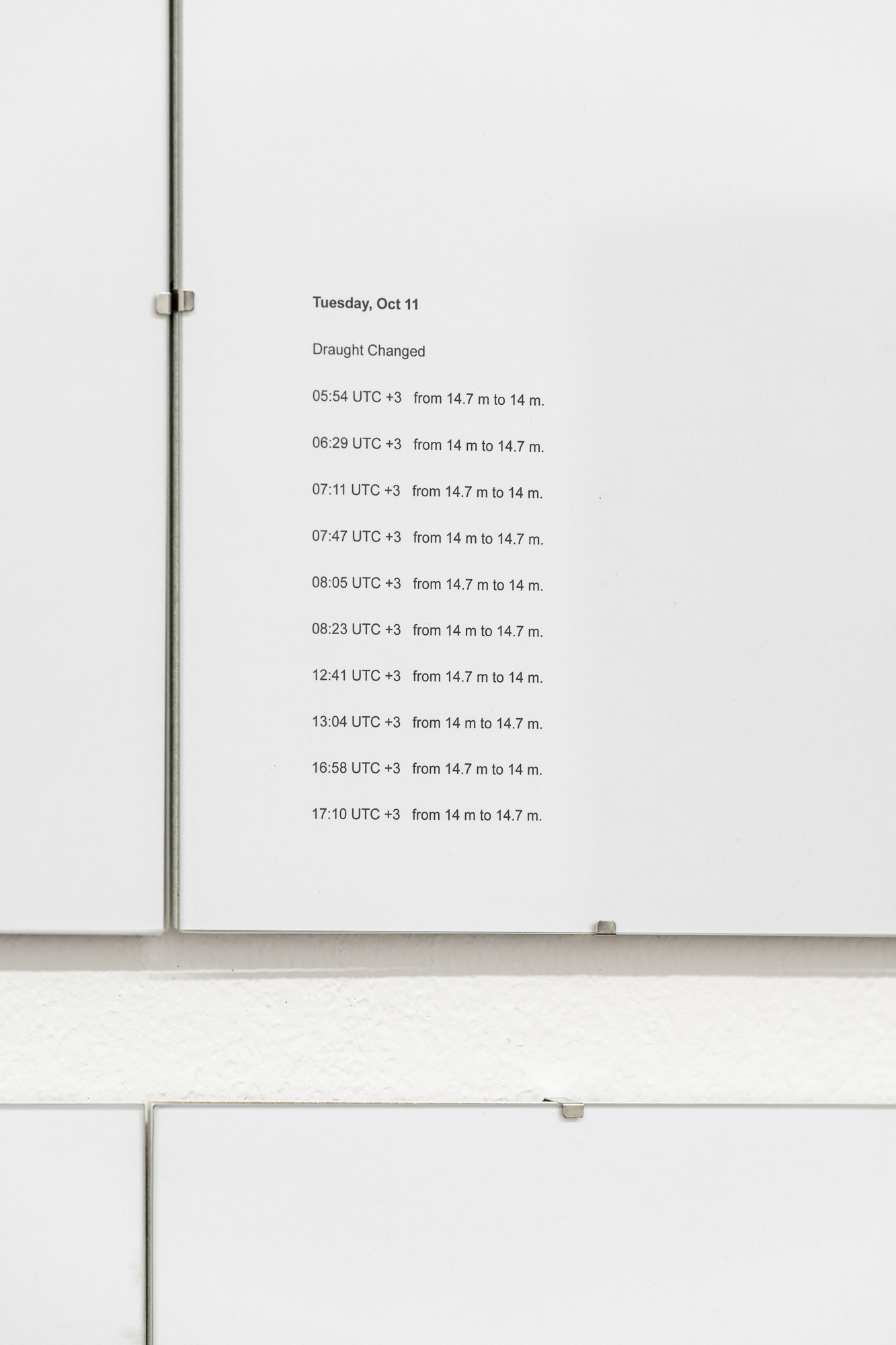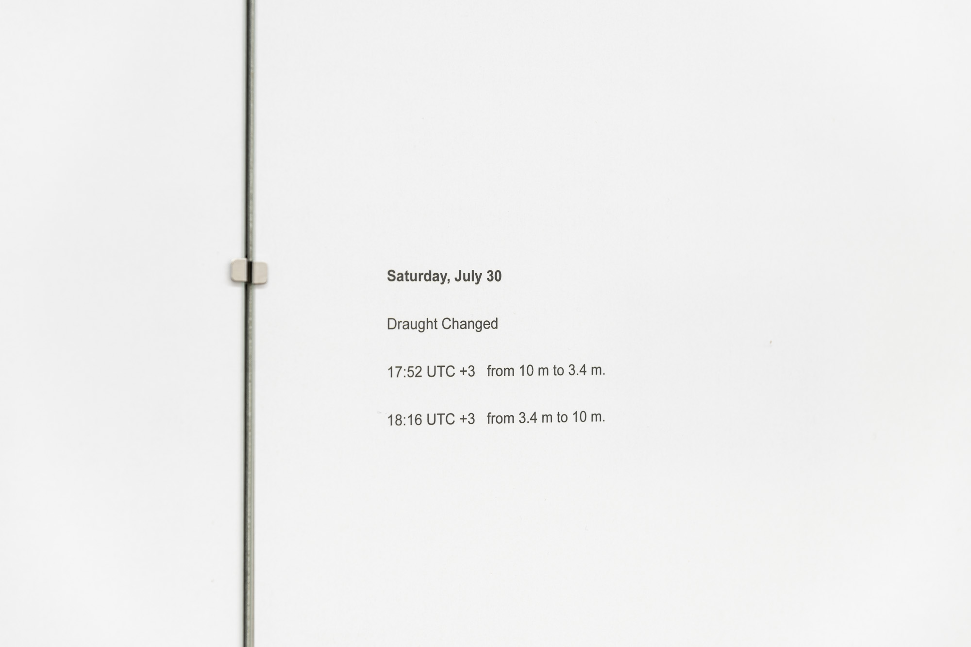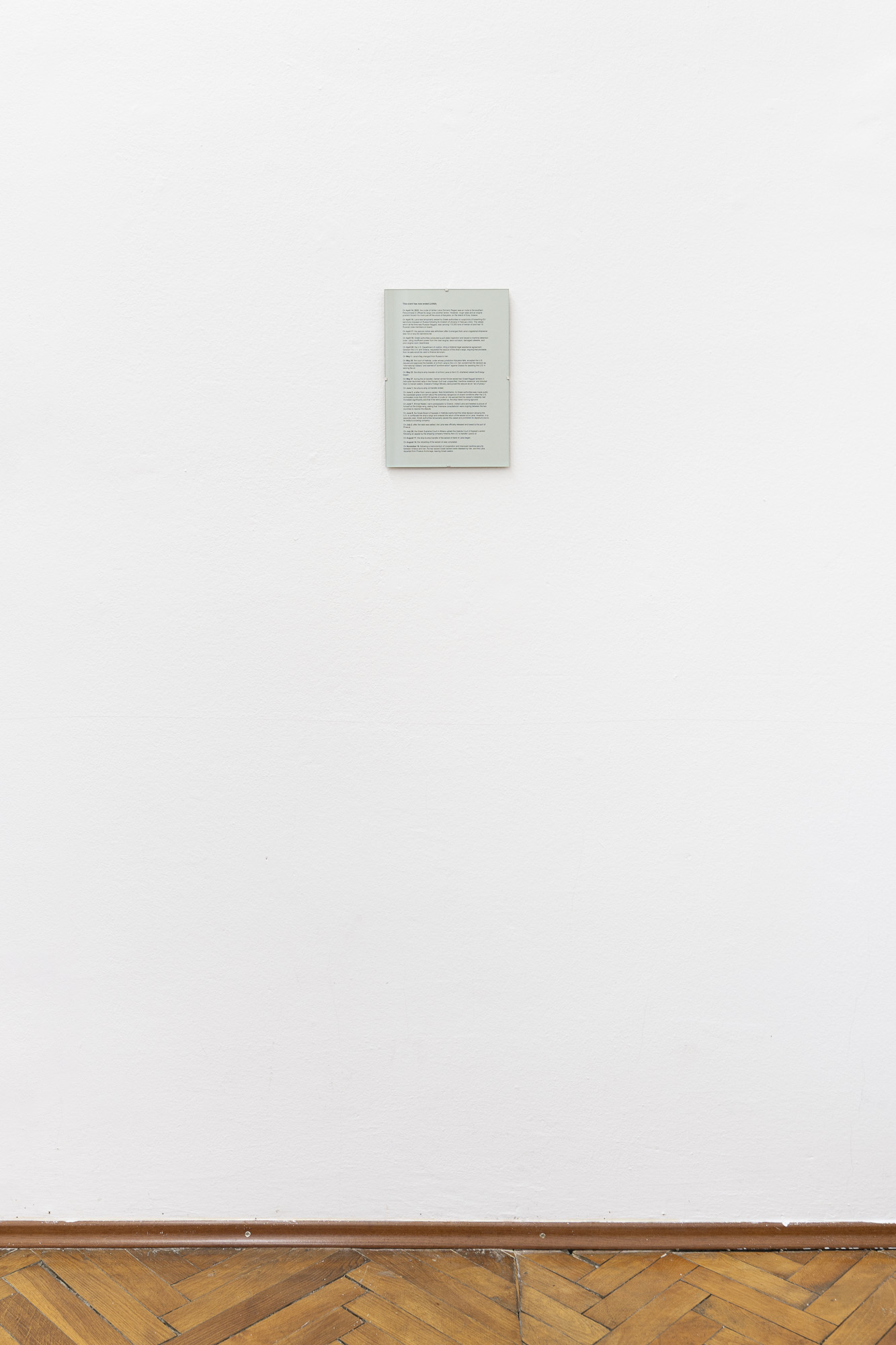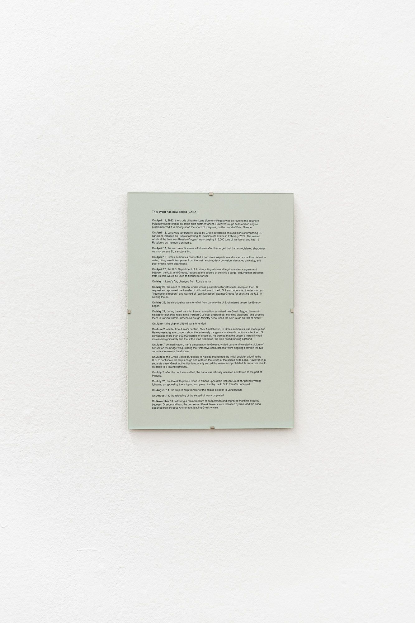 The second project, This event has now ended (LANA) (2023), examines the 2022 Iran–Greece naval incident through the events surrounding the Russian-flagged tanker Lana. Impounded at Karystos in April 2022 under EU sanctions, part of its Iranian oil was later seized by U.S. authorities, prompting Iran to detain two Greek tankers in retaliation. The dispute ended when Greek courts overturned the seizure and ordered the oil returned. Drawing on press, social media, and marine-tracking research, the work presents a two-part timeline—from the ship’s arrival to its departure—charting changes in the vessel’s draft alongside the case’s unfolding political developments.
