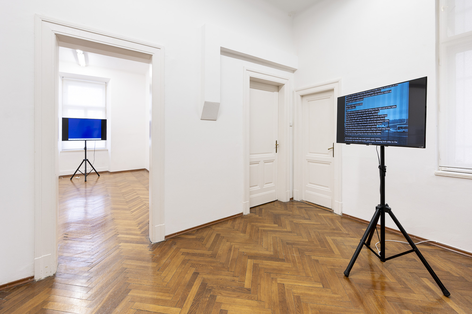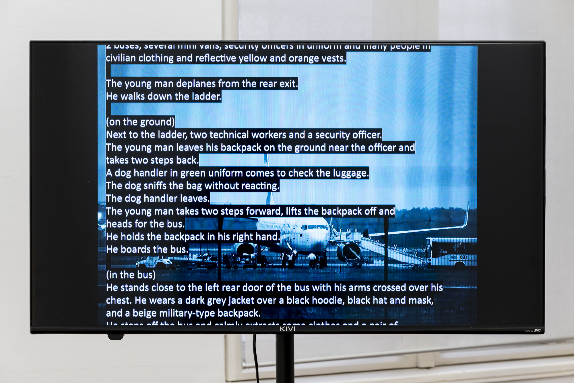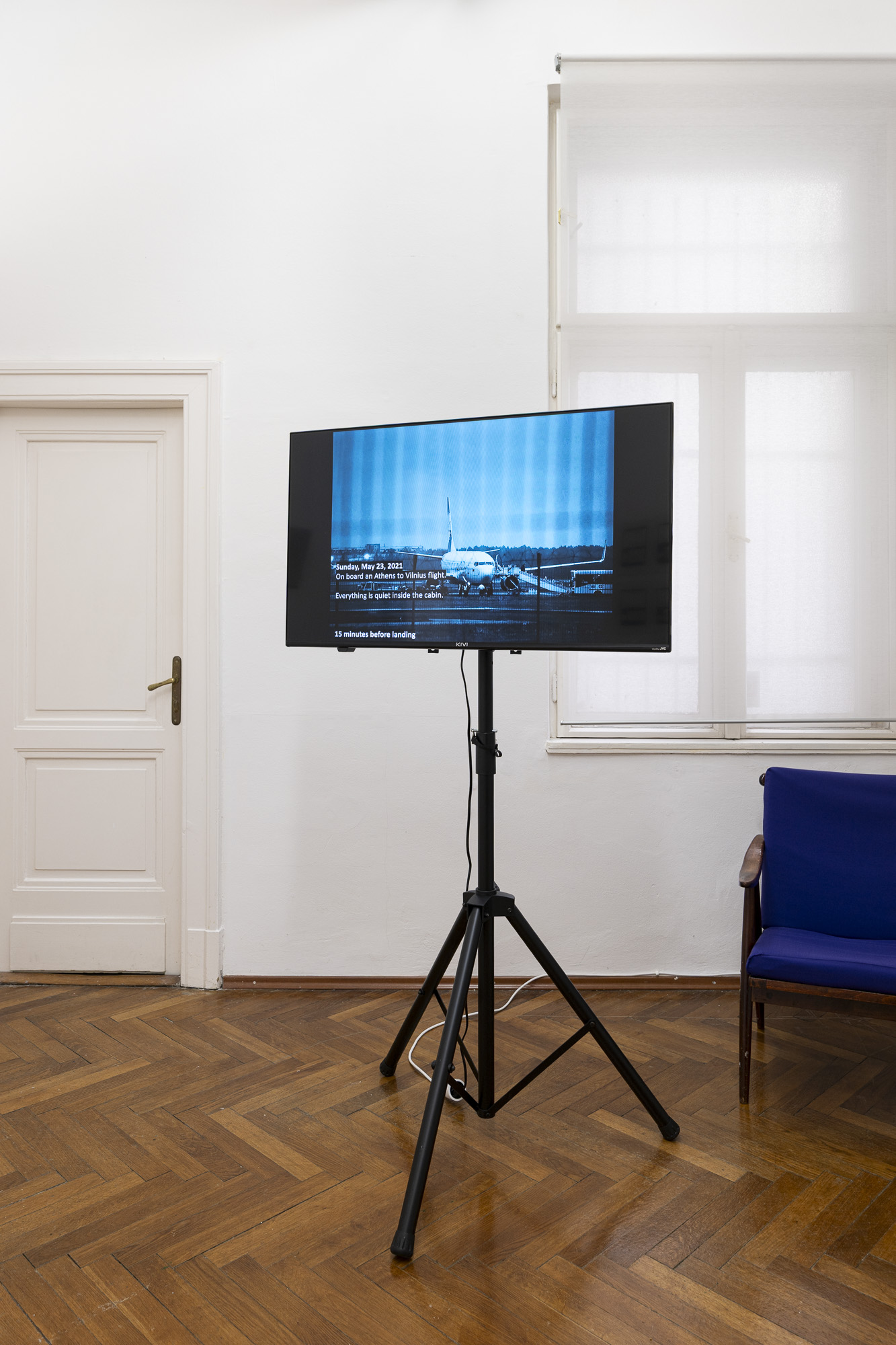 The third project, No event for Sunday, May 23, 2021 (2022), is a video that revisits the diversion of the Athens–Vilnius flight to Minsk and the arrest of Belarusian opposition figure Roman Protasevich. Framed by debates over the possible presence of foreign intelligence operatives at Athens International Airport, the work traces—through a text-led sequence—the first 22 days of Protasevich’s detention as reported in the media, focusing on gestures, posture, clothing, and the interiors in which he appeared.